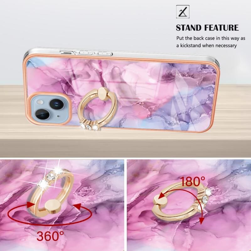 For iPhone 15 Electroplating Marble Dual-side IMD Phone Case with Ring(Pink 013)