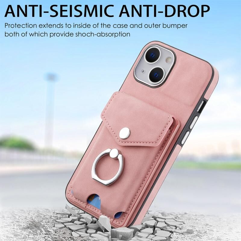 Θήκη τηλεφώνου δερμάτινη με λεπτό μεταλλικό φινίρισμα και θήκη καρτών για iPhone 15 (ρόζ)
