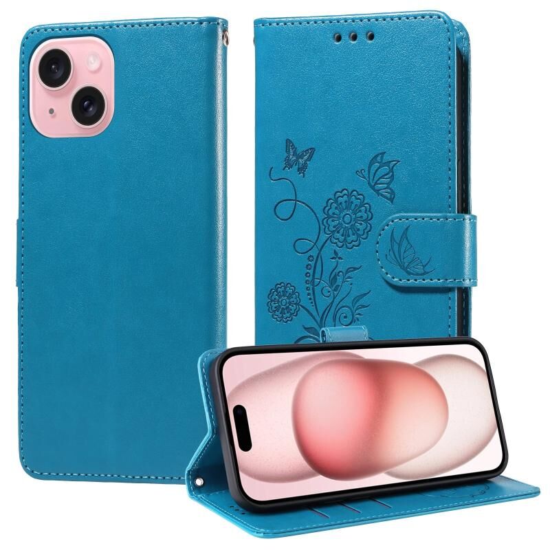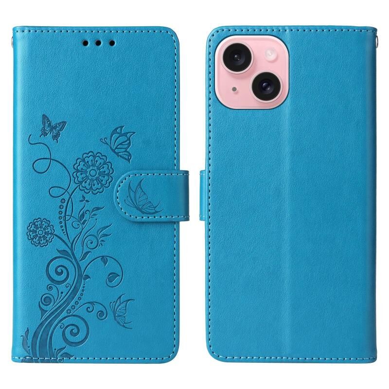 Θήκη τηλεφώνου από δέρμα με ανάγλυφα λουλούδια και πεταλούδες για iPhone 15 (Χρυσό)