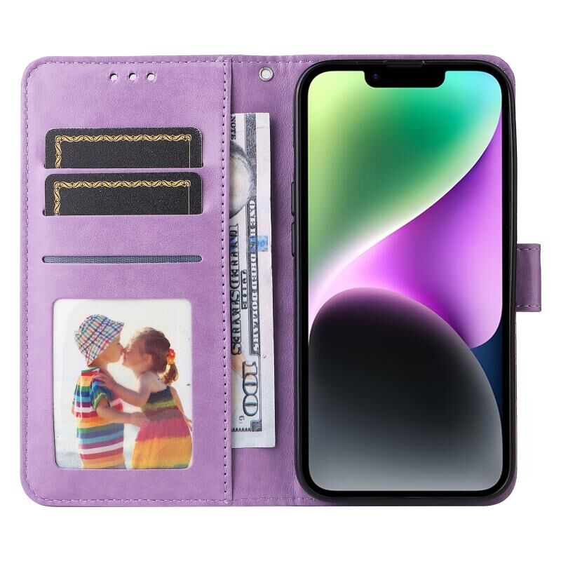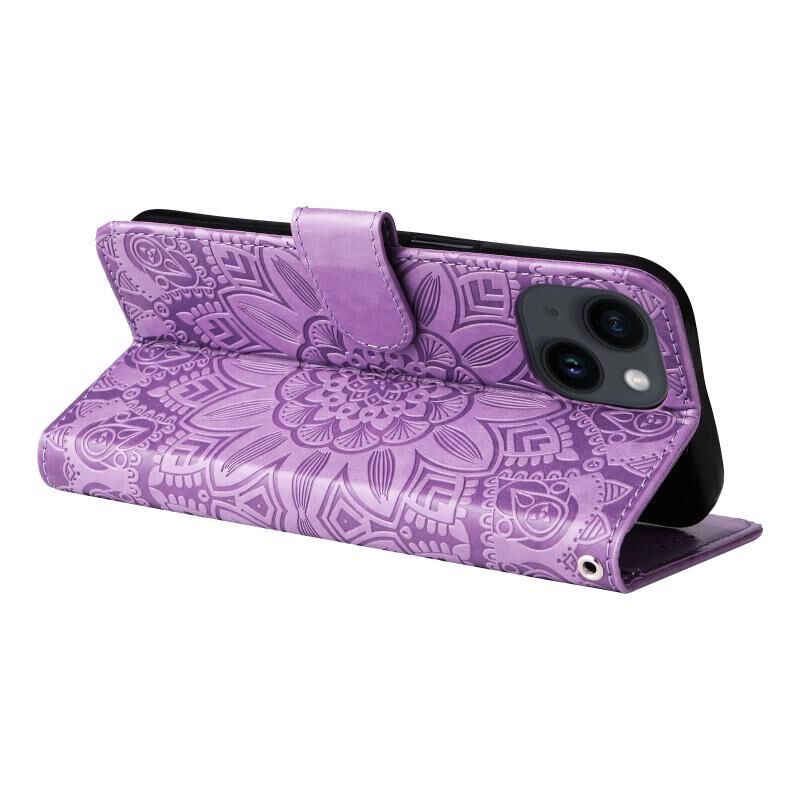 For iPhone 15 Embossed Sunflower Leather Phone Case(Purple)
