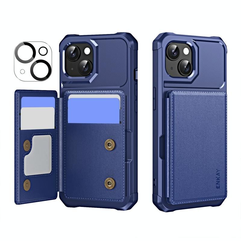 For iPhone 15 ENKAY Hat-Prince Card Slot Wallet TPU Back Leather Phone Case with Lens Film(Dark Blue) (ENKAY)