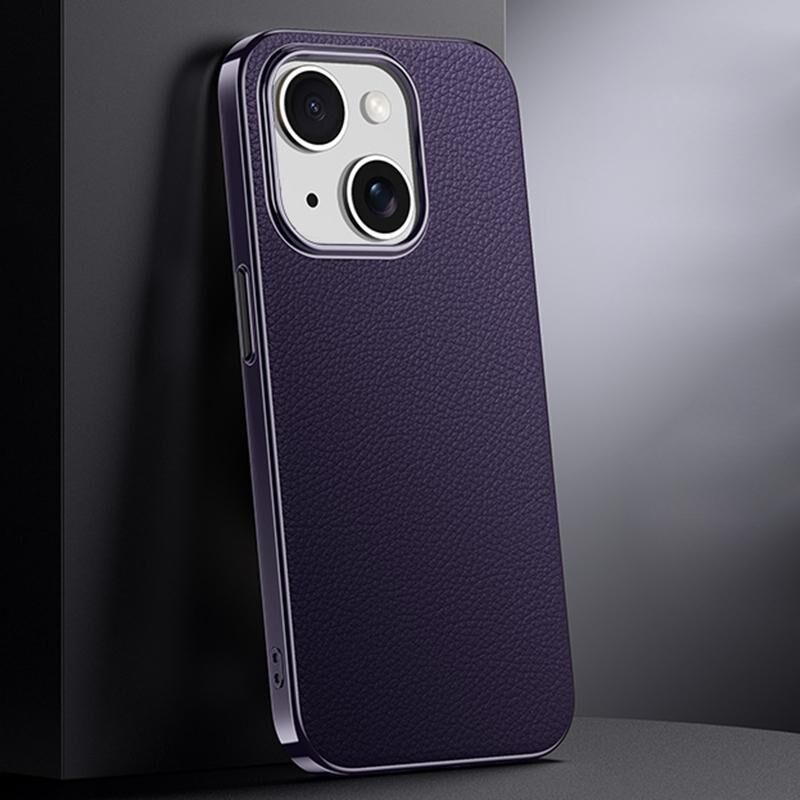 For iPhone 15 First Layer Cowhide Leather Electroplated PC Phone Case(Dark Purple)