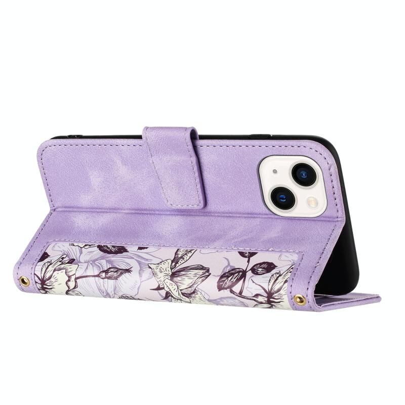Θήκη τηλεφώνου από δέρμα με λουλουδάτο σχέδιο για iPhone 15 με κορδόνι (Ανοιχτό Μωβ)