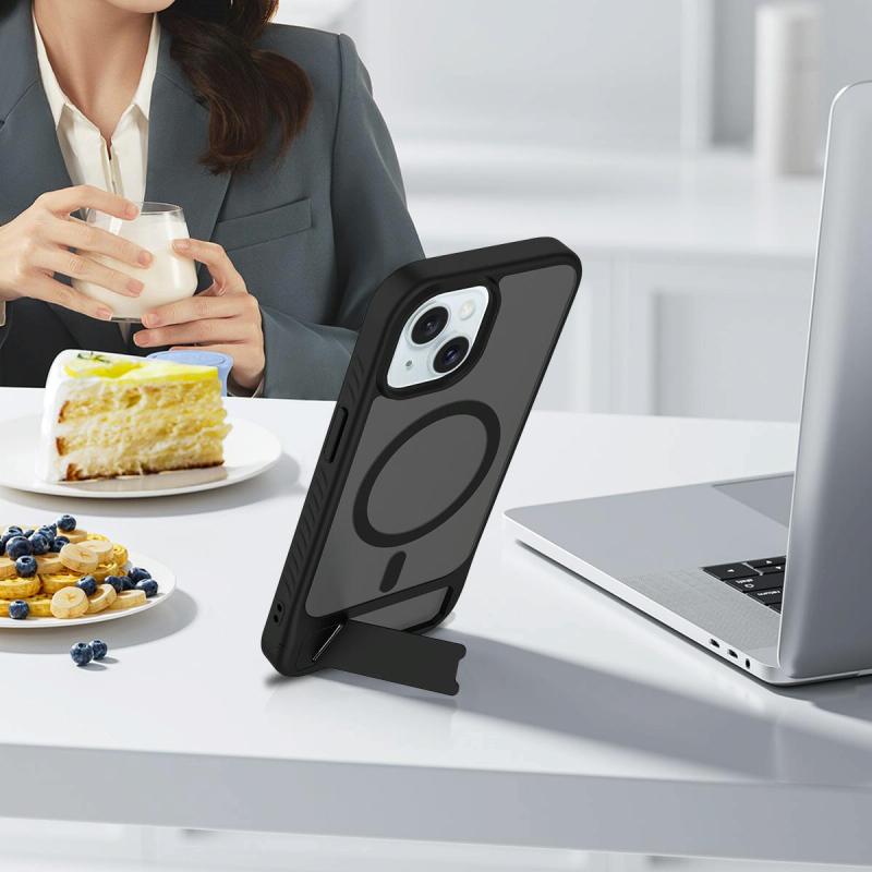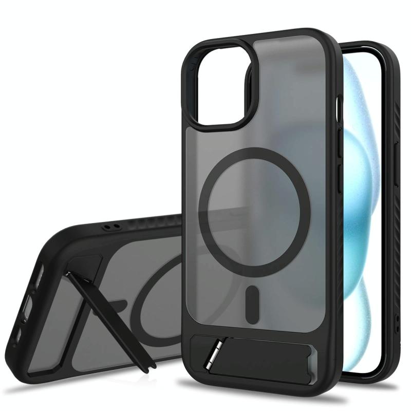 For iPhone 15 Frosted Holder PC Hybrid TPU MagSafe Phone Case(Black)