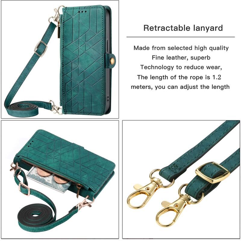 Θήκη τηλεφώνου δερμάτινη με φερμουάρ και γεωμετρικό σχέδιο για iPhone 15, με πλευρική αγκράφα και λουρί crossbody (πράσινο)