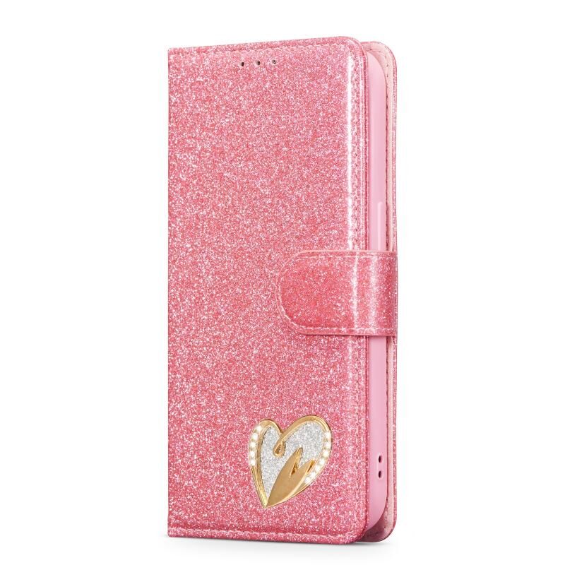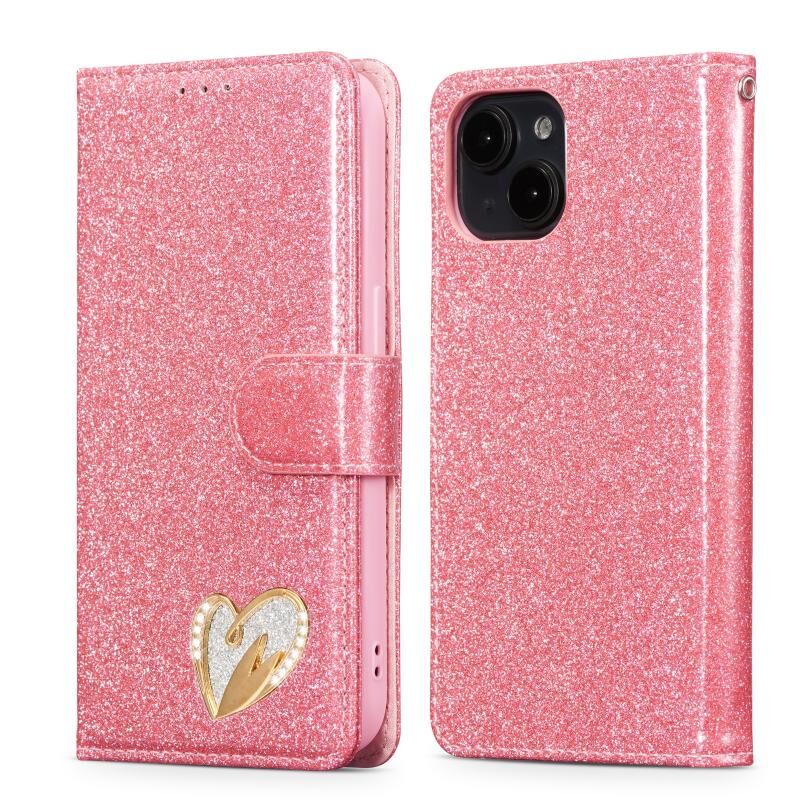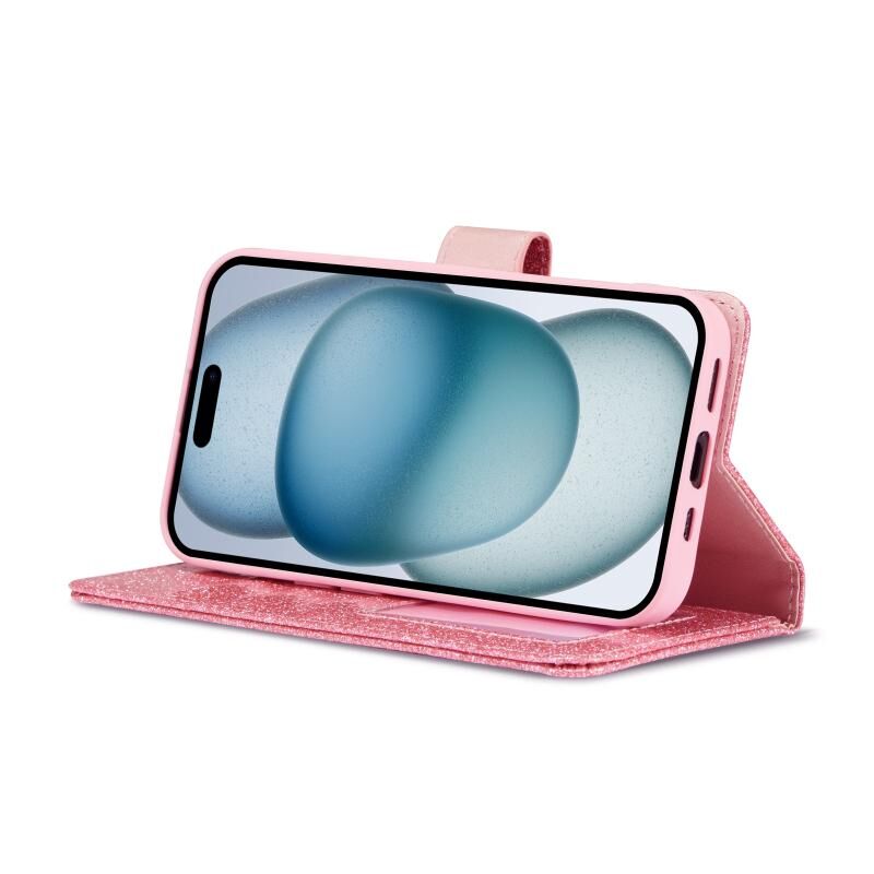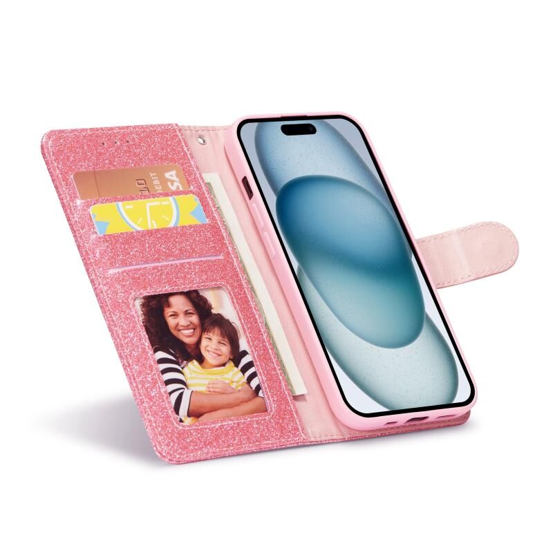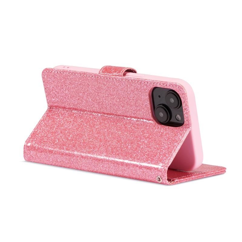 Θήκη τηλεφώνου για iPhone 15 με γκλίτερ, σκόνη και δέρμα (Ροζέ κόκκινο)