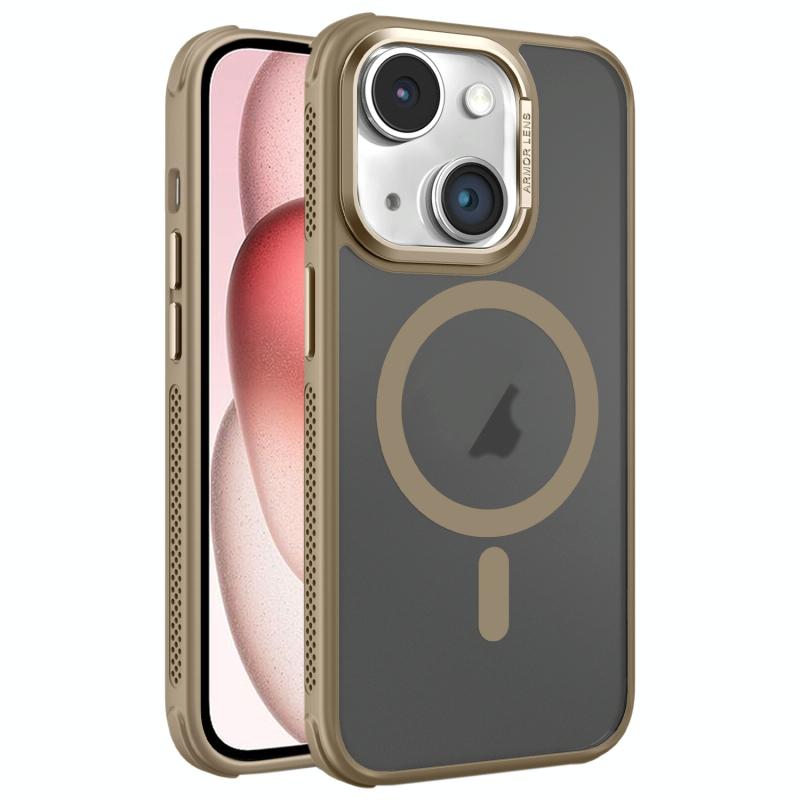 For iPhone 15 Hardware Side Cooling Skin Feel Frosted Metal Lens Frame MagSafe Phone Case(Gold)