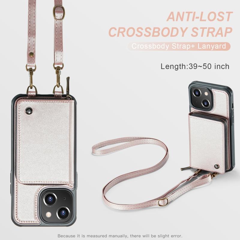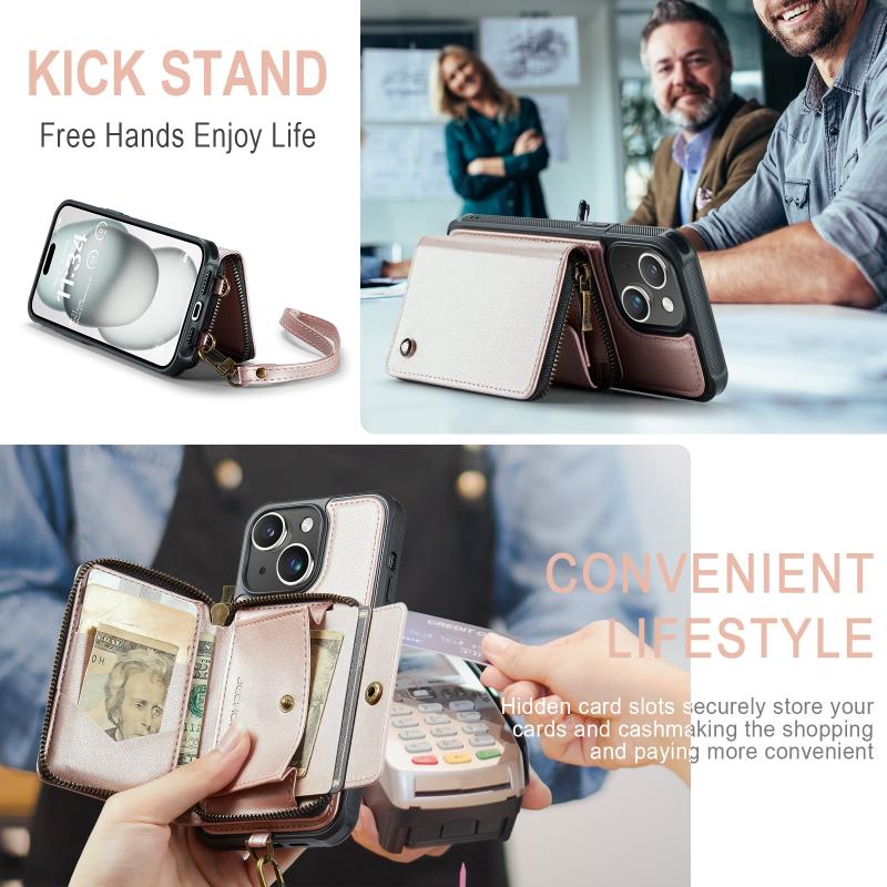 For iPhone 15 JEEHOOD C22 Series Zipper Wallet Leather Phone Case with Dual Lanyard(Rose Gold) (JEEHOOD)
