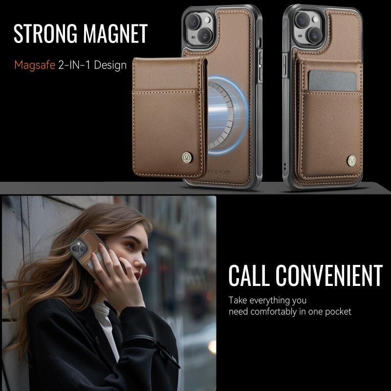 For iPhone 15 JEEHOOD J06 British Style RFID MagSafe Card Bag PU Phone Case(Brown) (JEEHOOD)