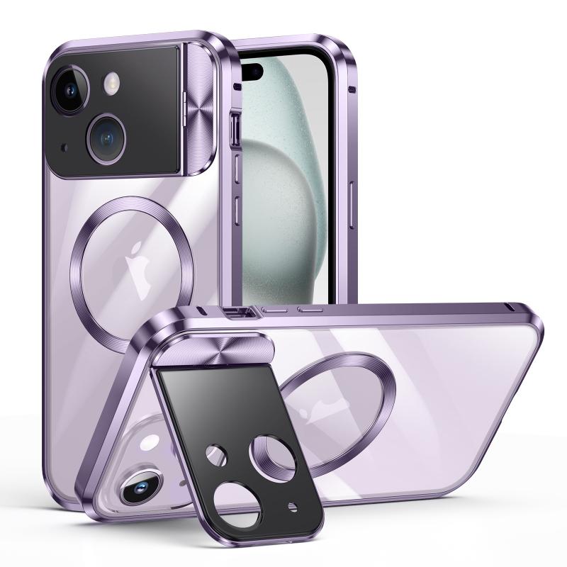 For iPhone 15 Large Window Holder MagSafe Magnetic Metal Phone Case(Purple)
