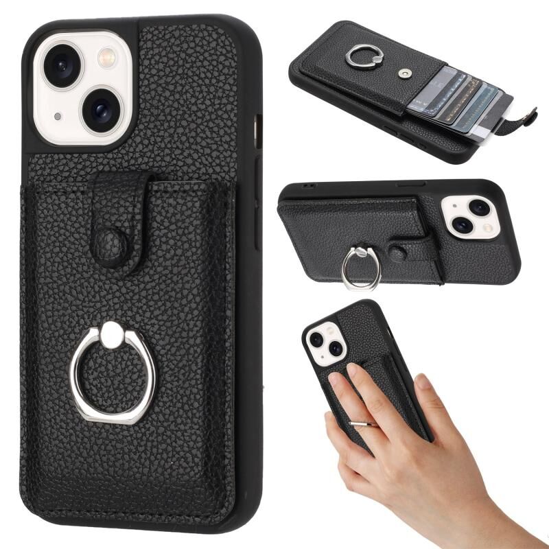Θήκη τηλεφώνου για iPhone 15 με σχέδιο δέρματος λυτσί, δακτύλιος στήριξης και κάρτες (Χρυσορόδινο)
