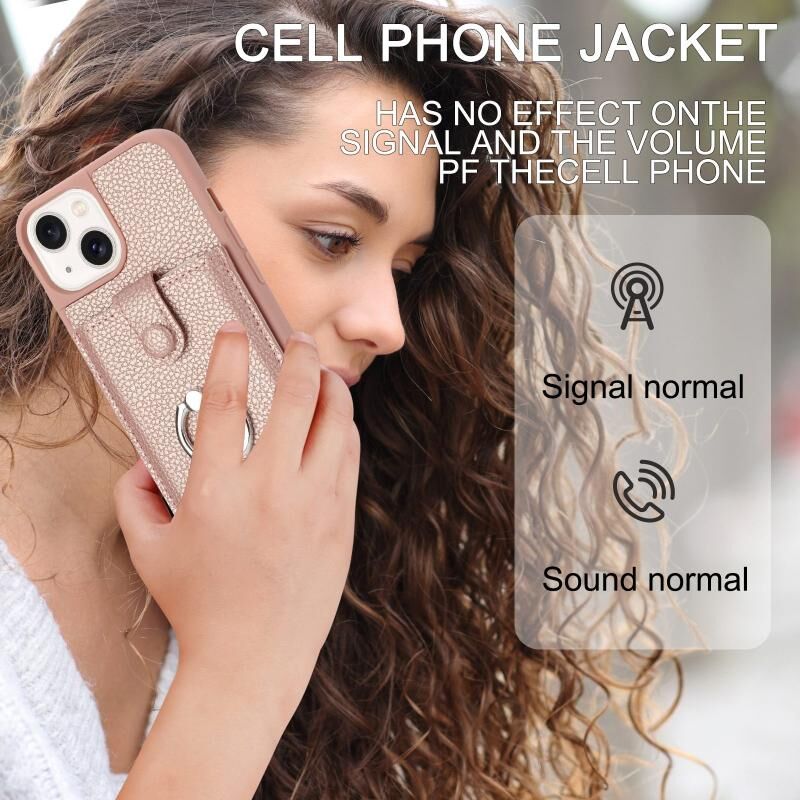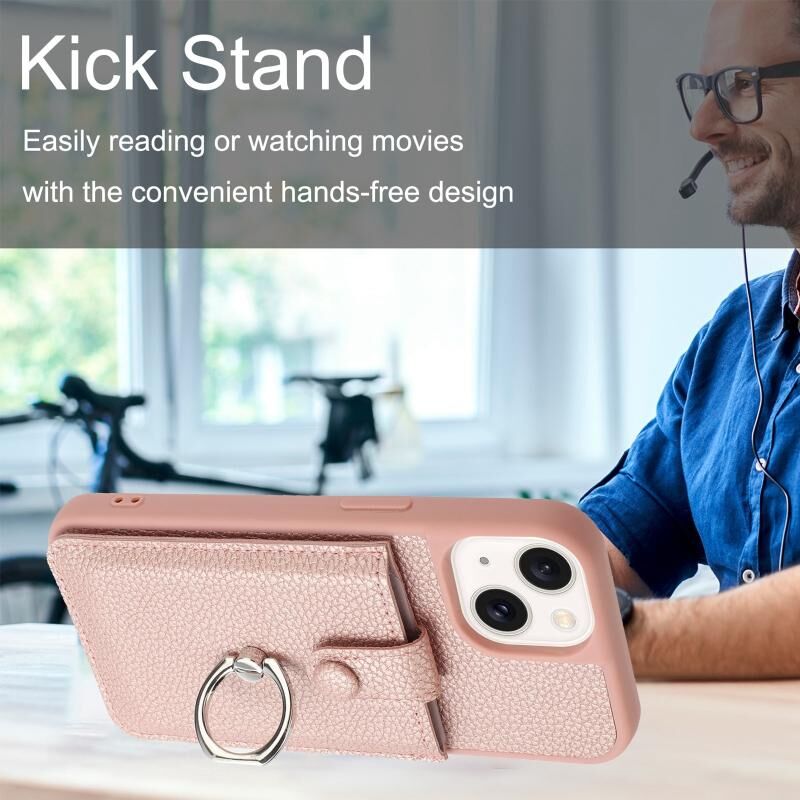 Θήκη τηλεφώνου για iPhone 15 με σχέδιο δέρματος λυτσί, δακτύλιος στήριξης και κάρτες (Χρυσορόδινο)