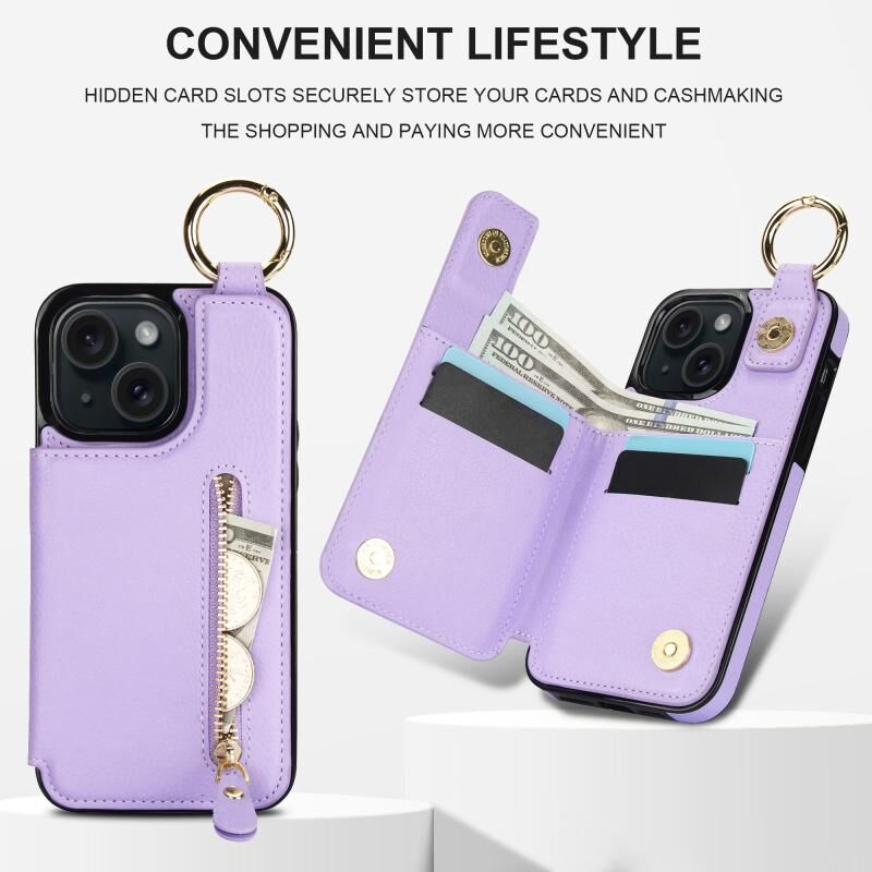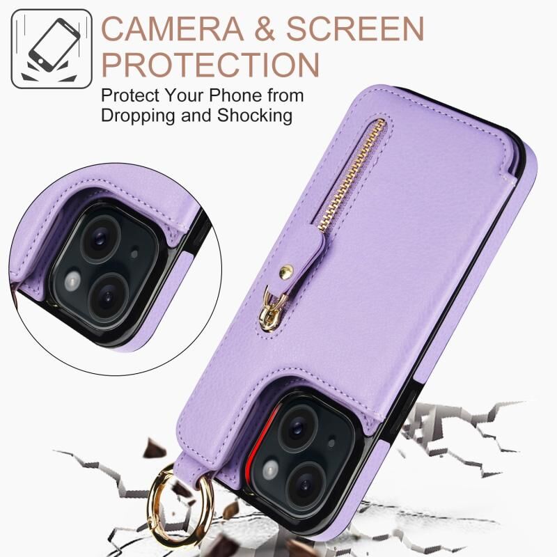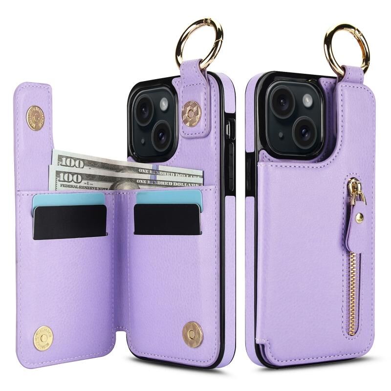 Για το iPhone 15 Litchi υφή φερμουάρ διπλή πόρπη κάρτα τσάντα υπόθεση τηλεφώνου (μωβ)