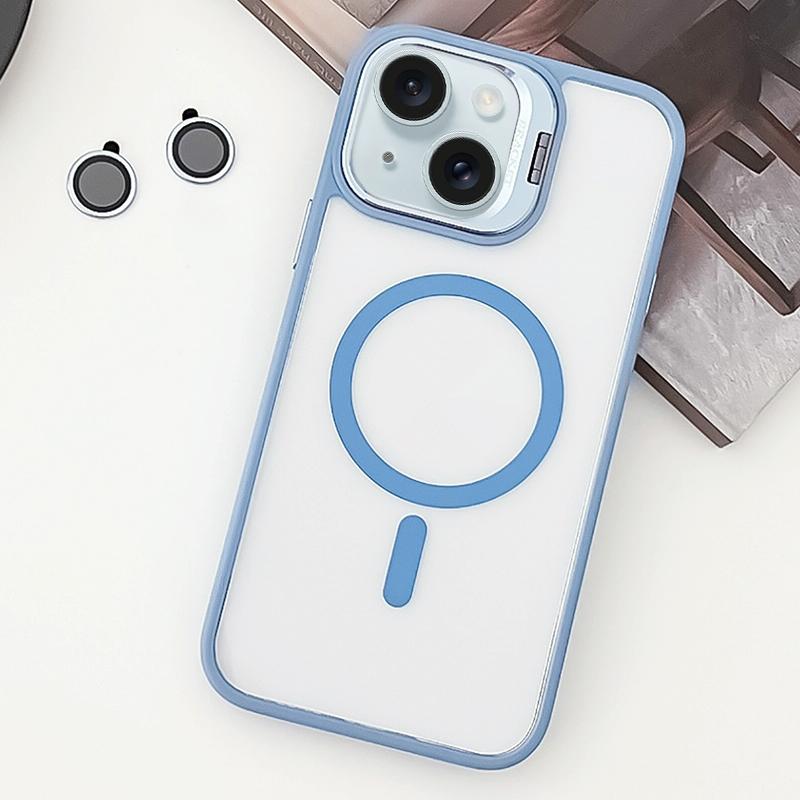 For iPhone 15 MagSafe Acrylic Hybrid TPU Holder Phone Case with Lens film(Light Blue)