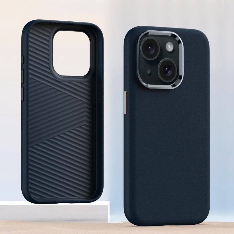 Θήκη κινητού τηλεφώνου για iPhone 15 με μεταλλικό πλαίσιο φακού, δερμάτινη πλήρης κάλυψη, αντικραδασμική (Μπλε)