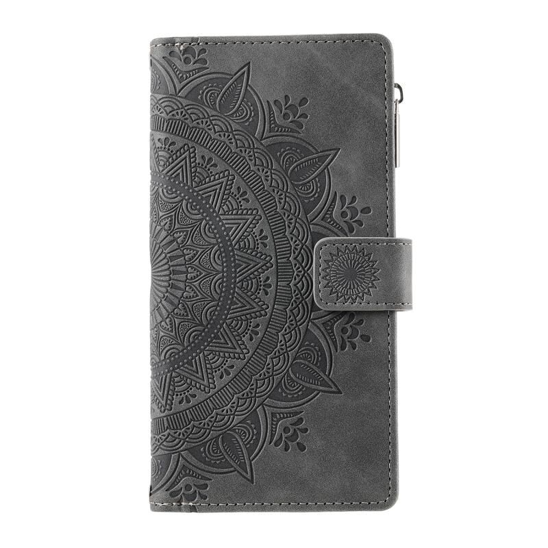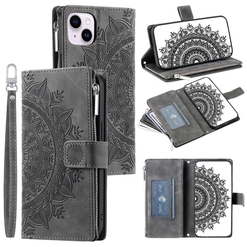 For iPhone 15 Multi-Card Totem Zipper Leather Phone Case(Grey)