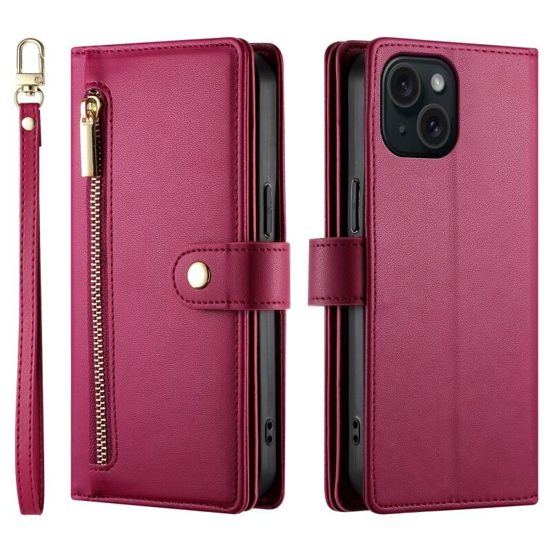 For iPhone 15 Nine Card-slot Zipper Wallet Bag Leather Phone Case(Red)