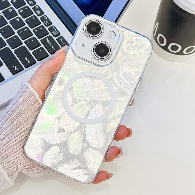 For iPhone 15 Plating Texture MagSafe TPU Phone Case with Glitter Lens Film(White Feathers)