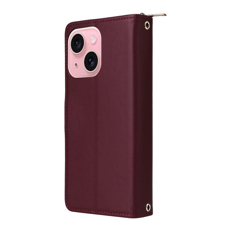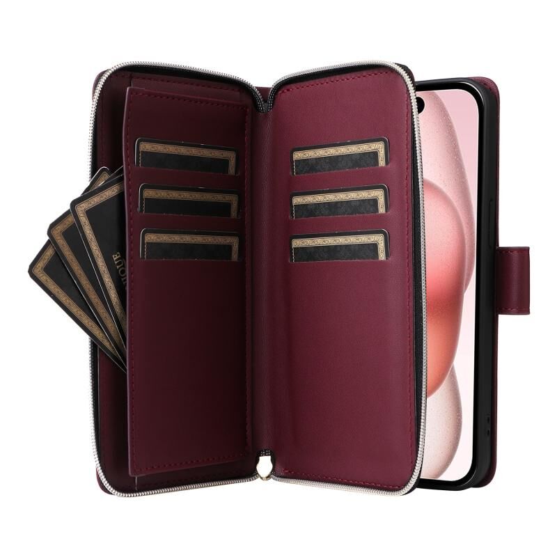 Θήκη τηλεφώνου από δέρμα με θήκη πορτοφολιού με φερμουάρ και εννέα θέσεις για κάρτες για iPhone 15 Plus / 14 Plus (Ανοιχτό Μωβ)