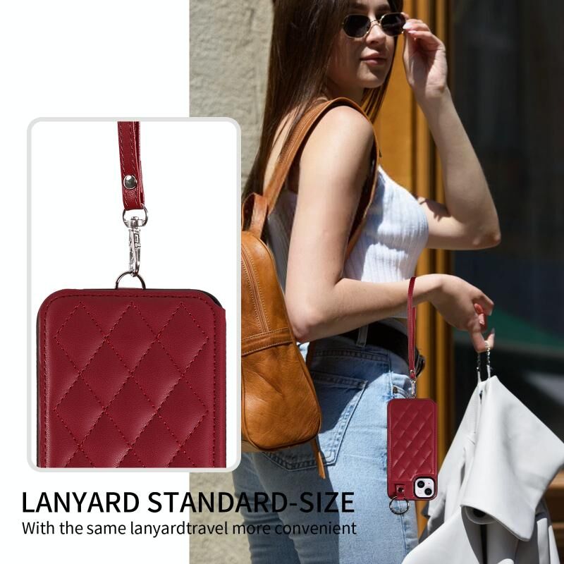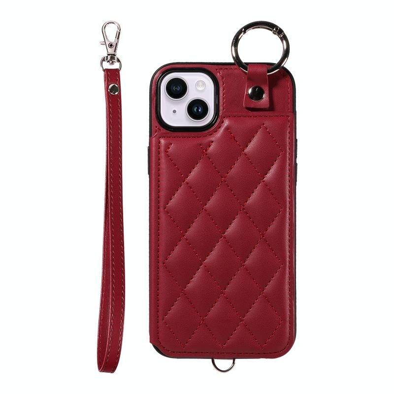 Θήκη τηλεφώνου με υφή ρόμβου και κοντό κορδόνι για iPhone 15 Plus / 14 Plus (Κρασοκόκκινο)