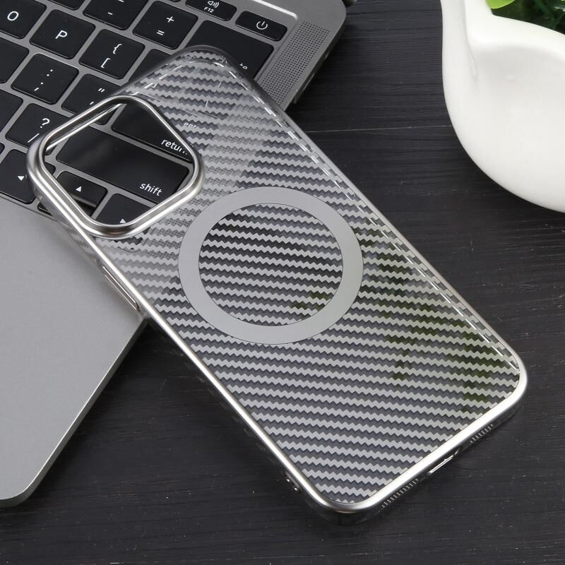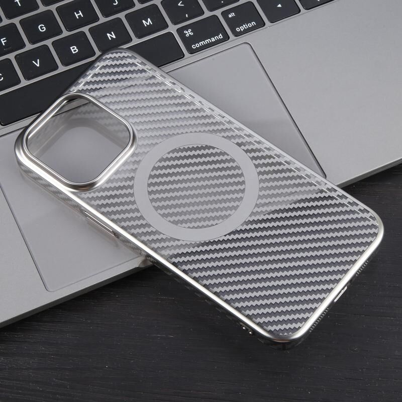 Θήκη κινητού τηλεφώνου για iPhone 15 Plus, διαφανής από πολυανθρακικό (PC) με επίστρωση ανθρακονημάτων 6D και MagSafe (Ασημί Αστρόφωτο).