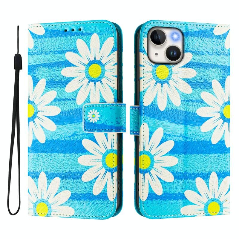 For iPhone 15 Plus Art Colored Drawing Pattern Leather Phone Case(Blue daisy)