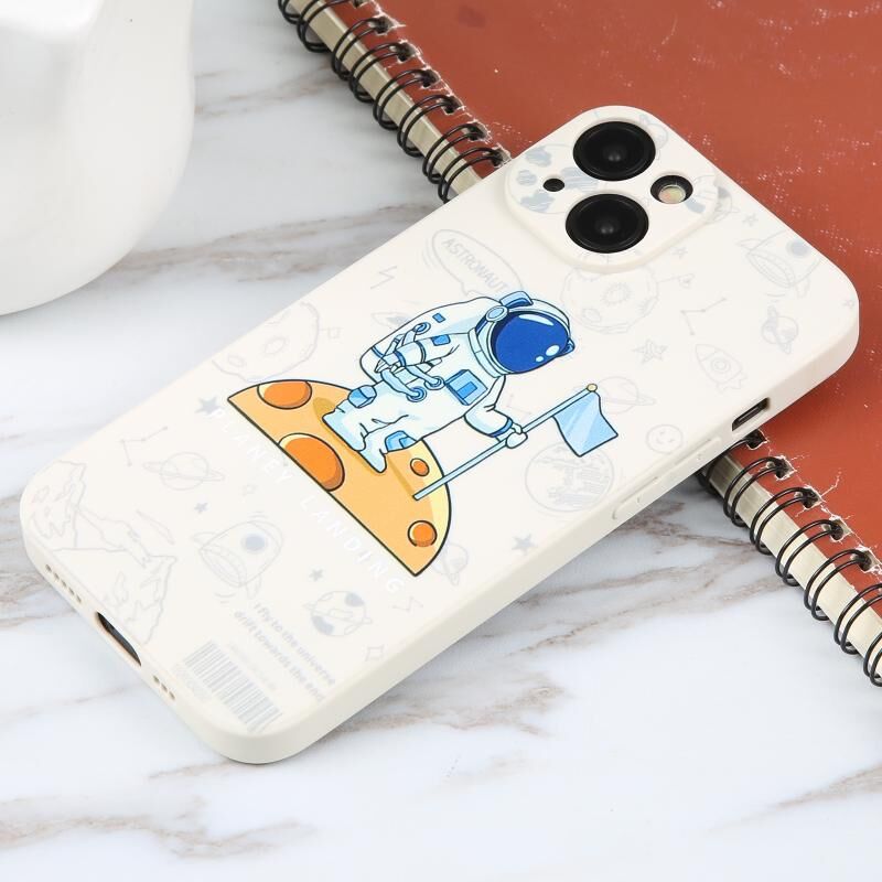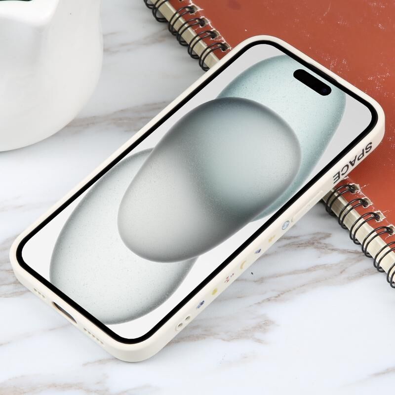 Θήκη τηλεφώνου για iPhone 15 Plus με σχέδιο αστροναύτη, σιλικόνης, ευθείας άκρης (Προσσελήνωση Πλανήτη - Λευκό)