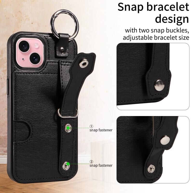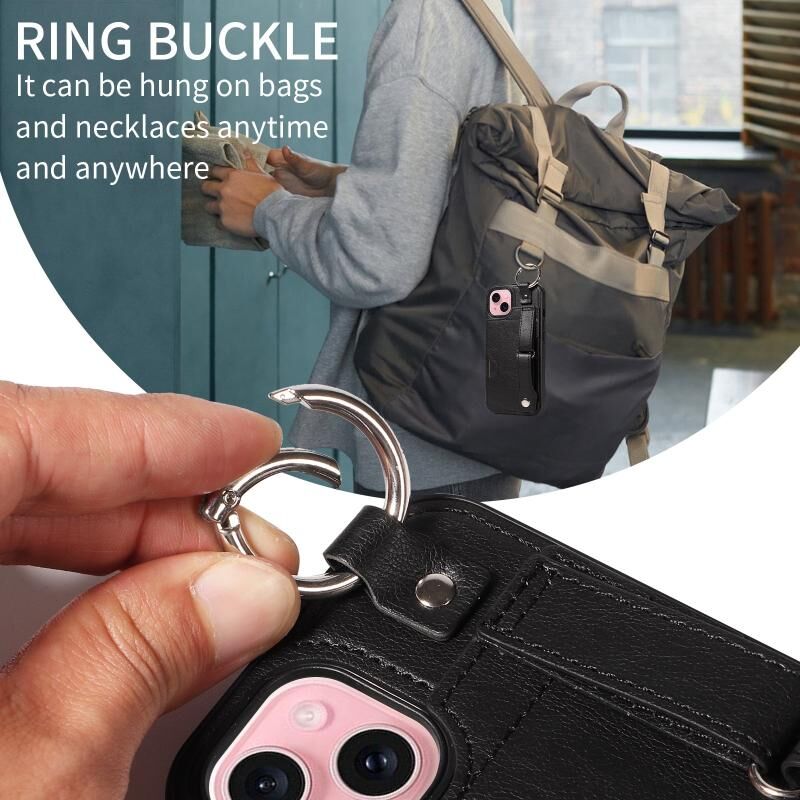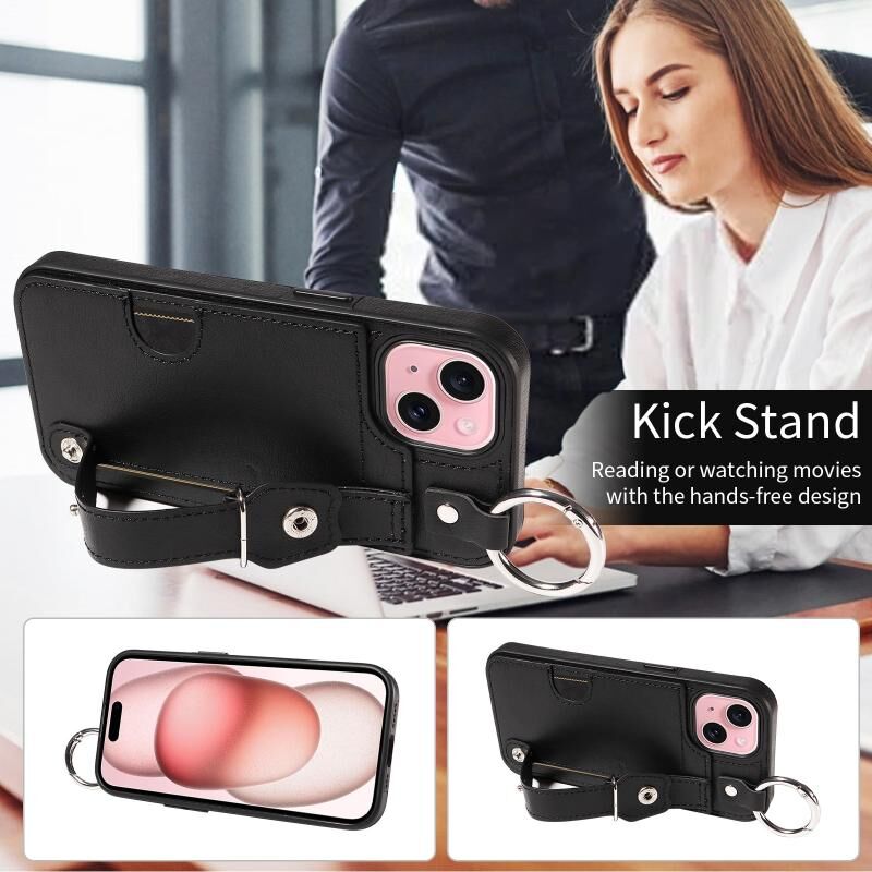 Θήκη τηλεφώνου για iPhone 15 Plus με υφή δέρματος μοσχαριού, υποδοχή κάρτας καρπού και δακτύλιο (Μαύρο)