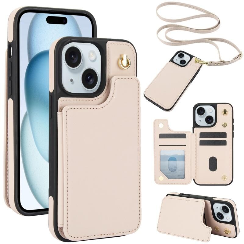 For iPhone 15 Plus Crossbody Dual-Buckle Wallet Back Leather Phone Case(Apricot)