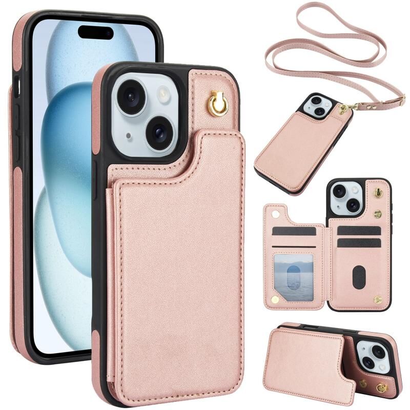 For iPhone 15 Plus Crossbody Dual-Buckle Wallet Back Leather Phone Case(Rose Gold)