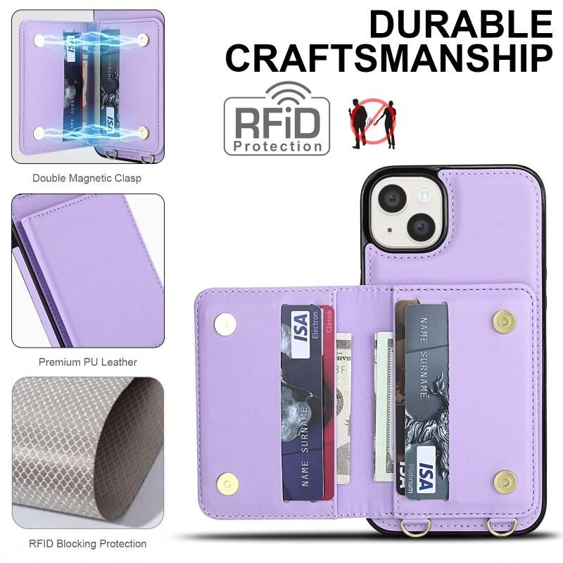 For iPhone 15 Plus Crossbody Dual-buckle Wallet RFID Back Leather Phone Case(Light Purple)