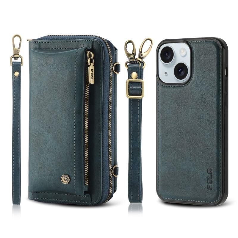 Θήκη τηλεφώνου από δέρμα με πολλαπλές λειτουργίες, φερμουάρ και λουρί για iPhone 15 Plus (Πράσινο)