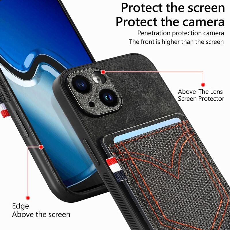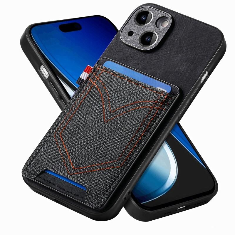 Θήκη τηλεφώνου από δέρμα με υφή τζιν για iPhone 15 Plus με θήκη για κάρτες (Μαύρο)