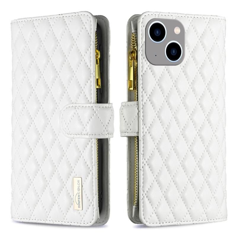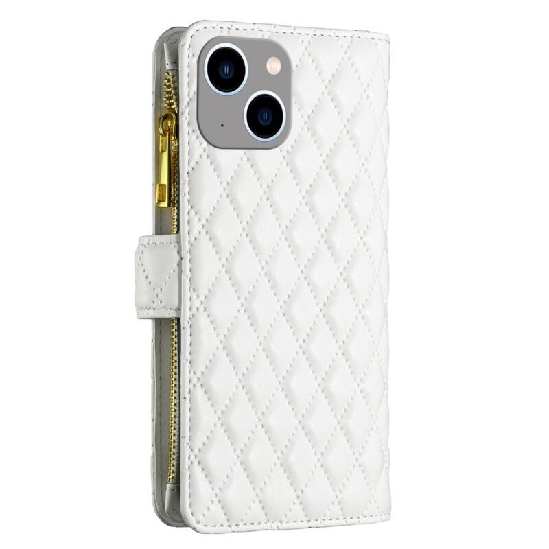 Θήκη τηλεφώνου τύπου flip από δέρμα με φερμουάρ και σχέδιο διαμαντένιου πλέγματος για iPhone 15 Plus (Μπλε)