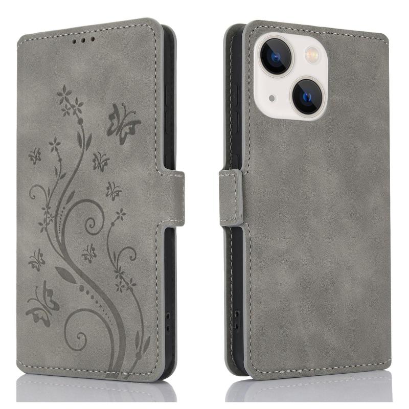 For iPhone 15 Plus Dreamy Butterfly Love Flower Embossed Leather Phone Case(Grey)