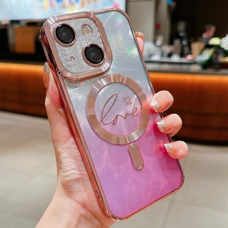 Θήκη τηλεφώνου TPU με μαγνητική σύνδεση Magsafe για iPhone 15 Plus, διπλή αγάπη, διαβαθμισμένη λάμψη φτερού (Ροζ)