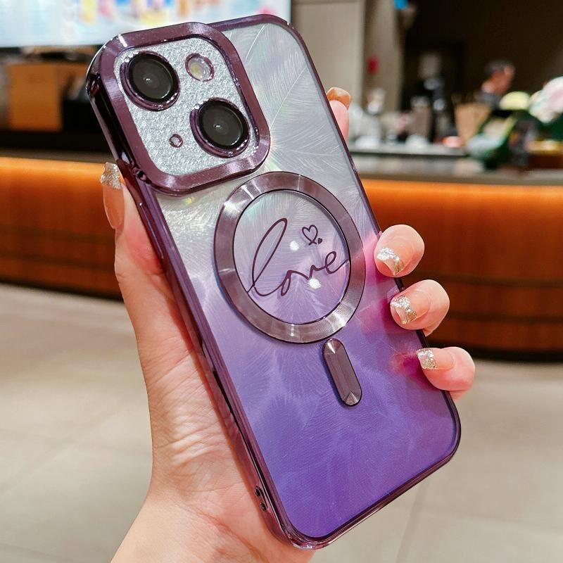 Θήκη τηλεφώνου για iPhone 15 Plus, Διπλή Αγάπη, Διαβαθμισμένη Λάμψη Φτερού, Magsafe, TPU (Χρυσό)