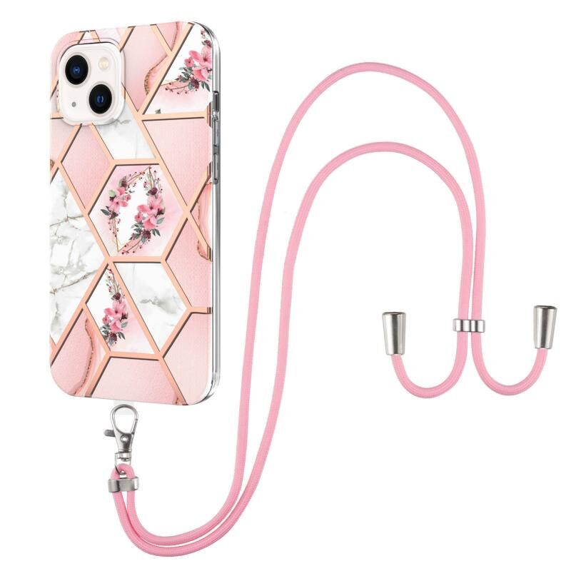 Θήκη για iPhone 15 Plus με ηλεκτρολυτική επιμετάλλωση, συνδυασμό μαρμάρου και λουλουδιών, από TPU με προστασία από κραδασμούς και λουρί (Ροζ Λουλούδι)