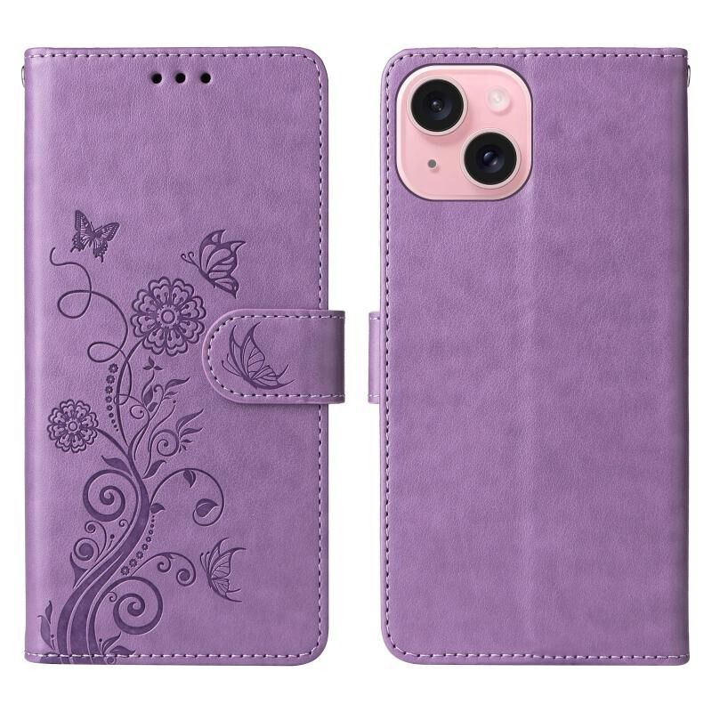 Θήκη τηλεφώνου από δέρμα με ανάγλυφα λουλούδια και πεταλούδες για iPhone 15 Plus (Μωβ)
