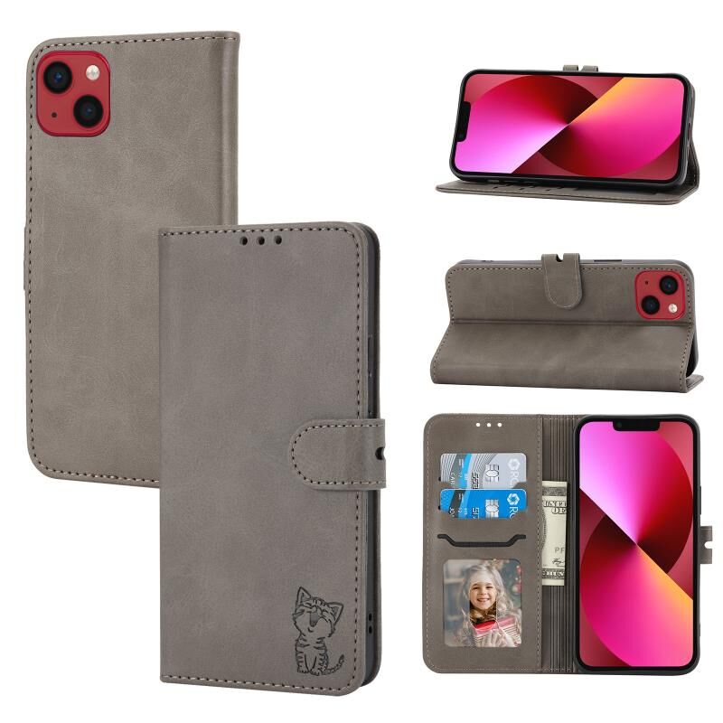 Θήκη τηλεφώνου από δέρμα με σχέδιο χαρούμενης γάτας σε ανάγλυφο για iPhone 15 Plus (Γκρι)