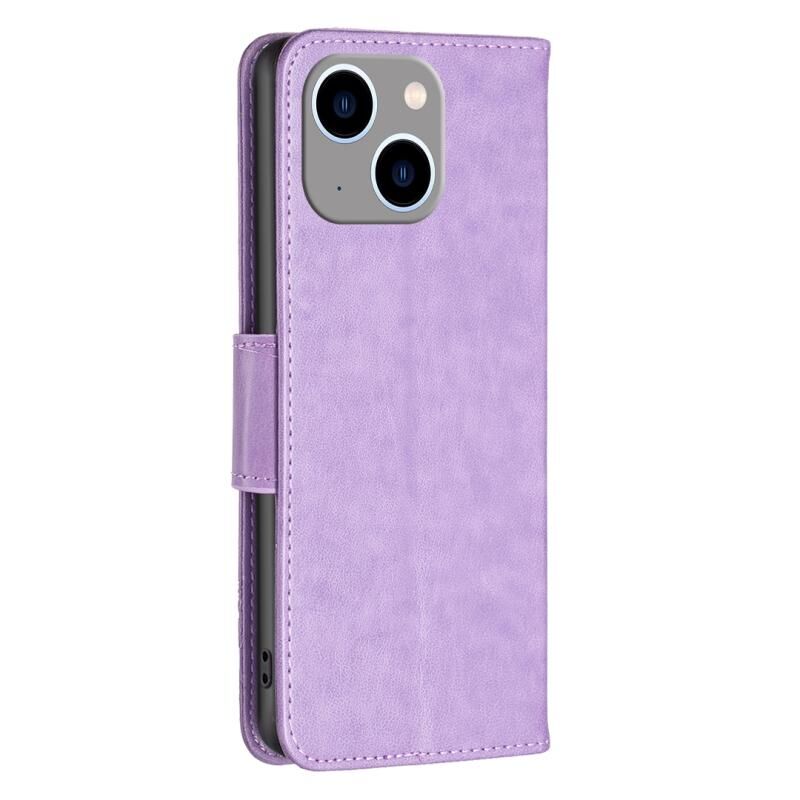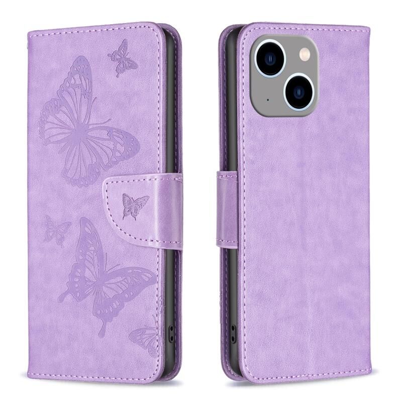 For iPhone 15 Plus Embossing Two Butterflies Pattern Leather Phone Case(Purple)