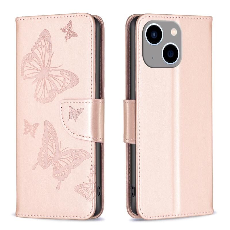For iPhone 15 Plus Embossing Two Butterflies Pattern Leather Phone Case(Rose Gold)