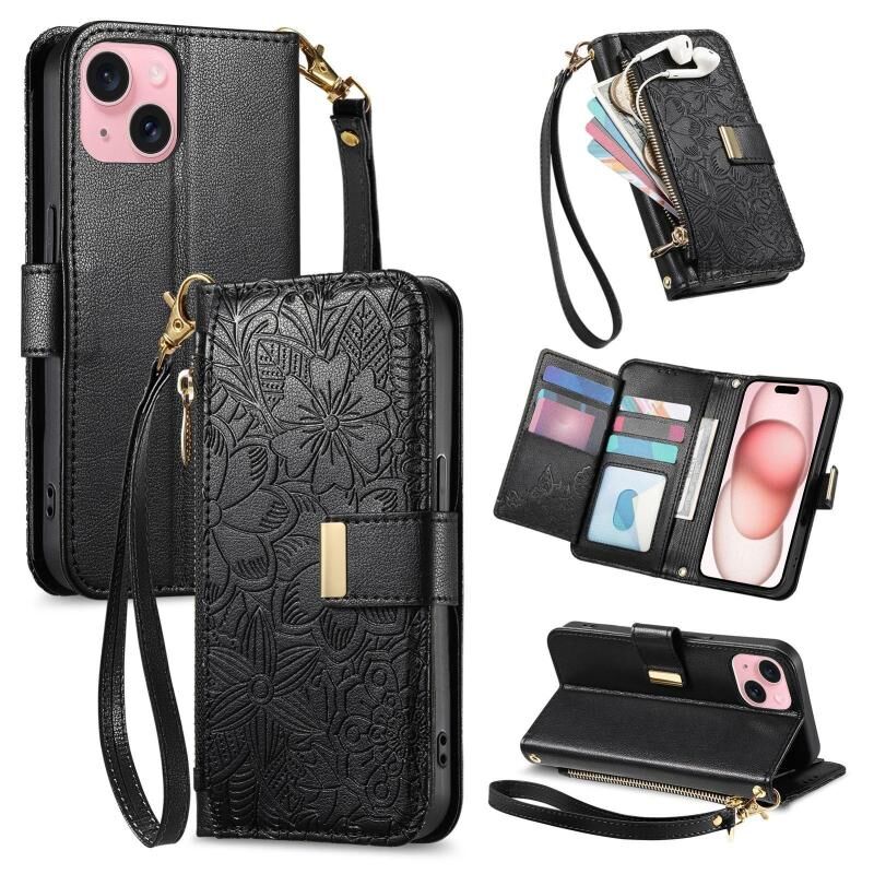 For iPhone 15 Plus Flowers Leaves Zipper Wallet Leather Phone Case with Strap(Black)