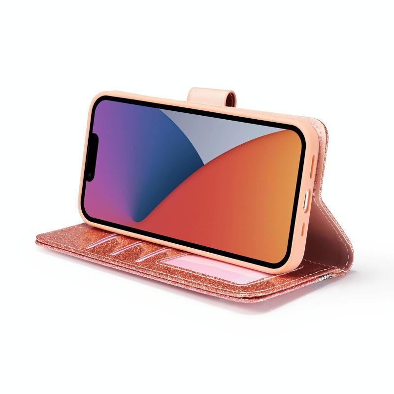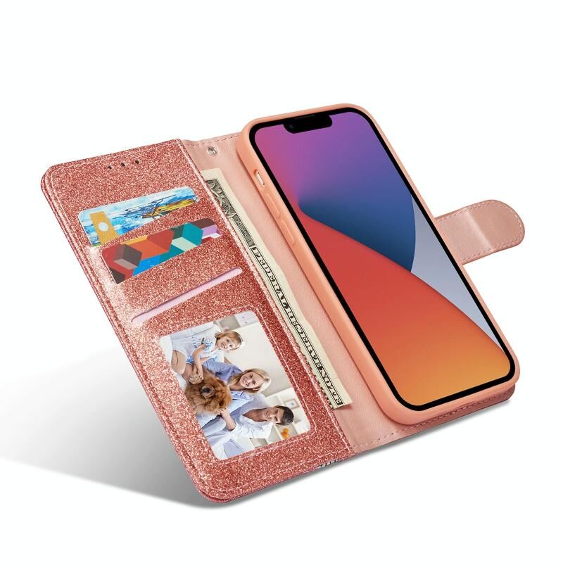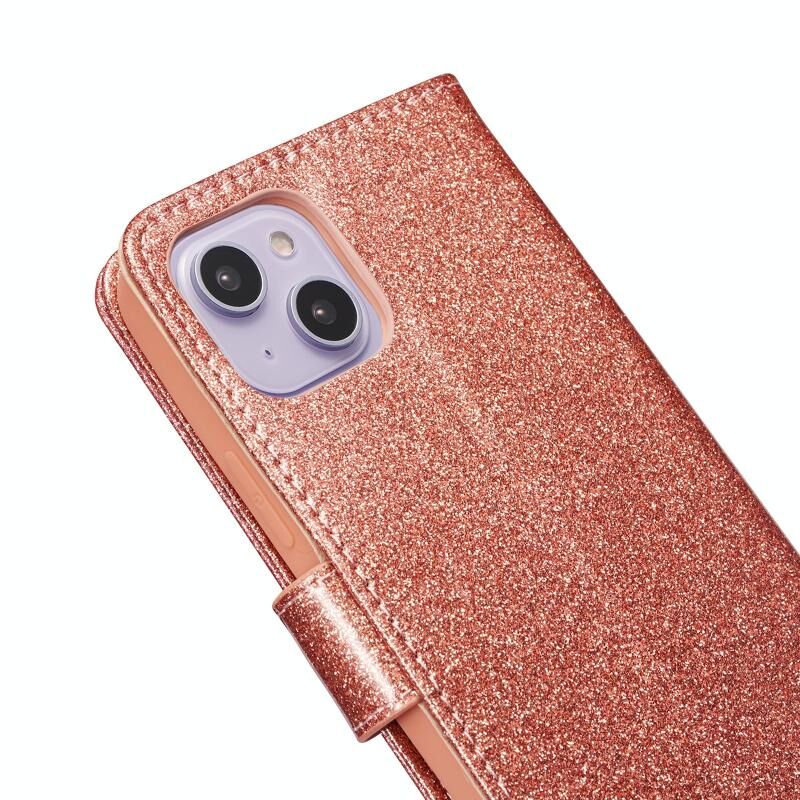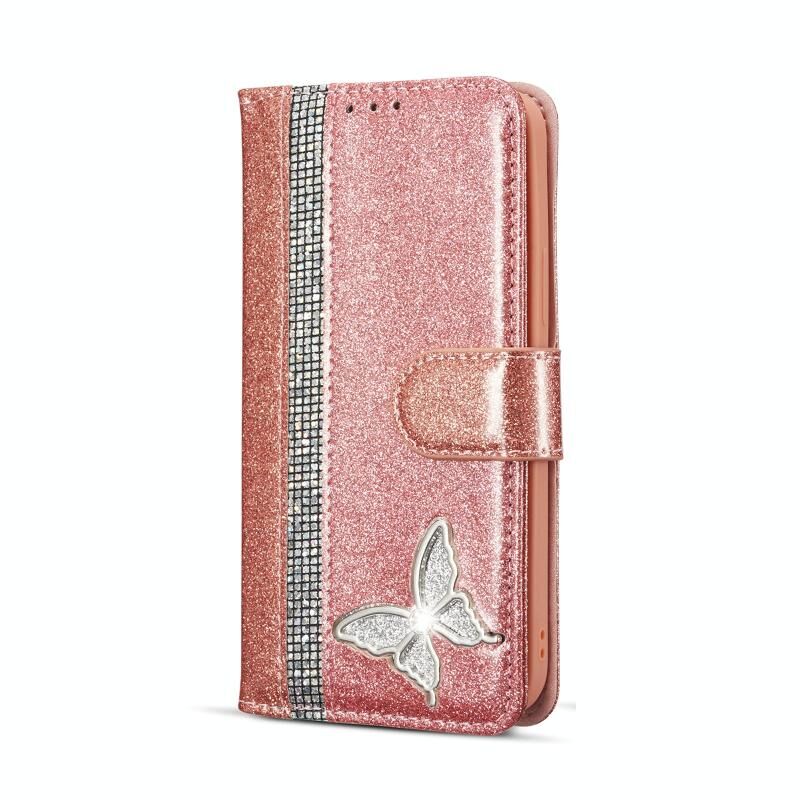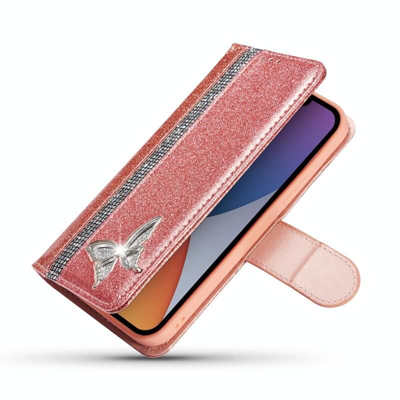 Θήκη τηλεφώνου για iPhone 15 Plus με γκλίτερ, πεταλούδες και δέρμα (Χρυσό ροζ)