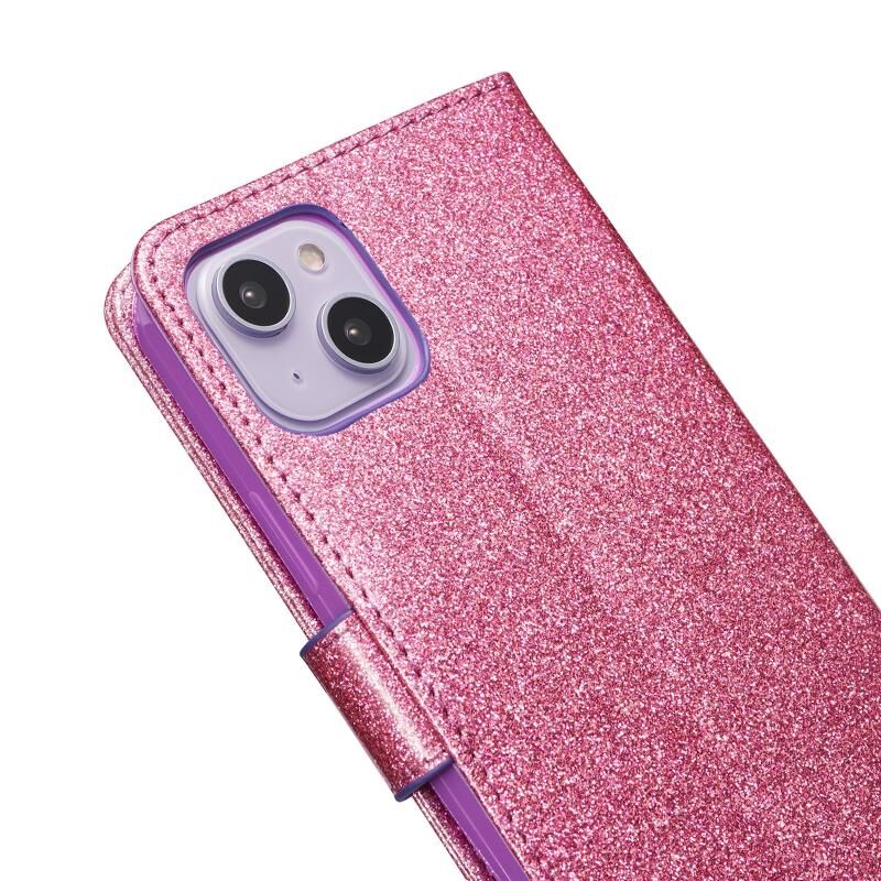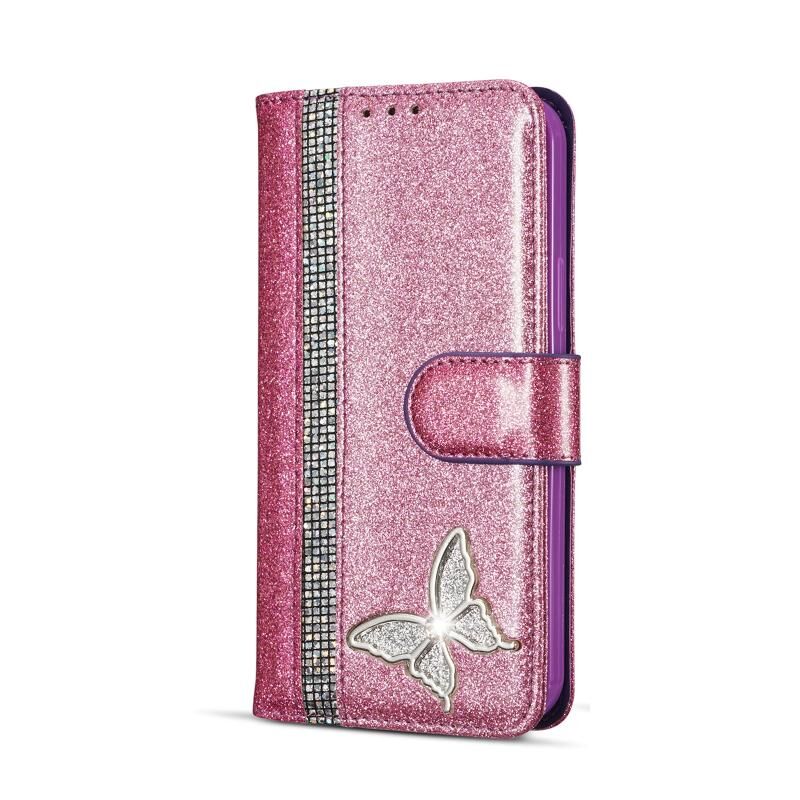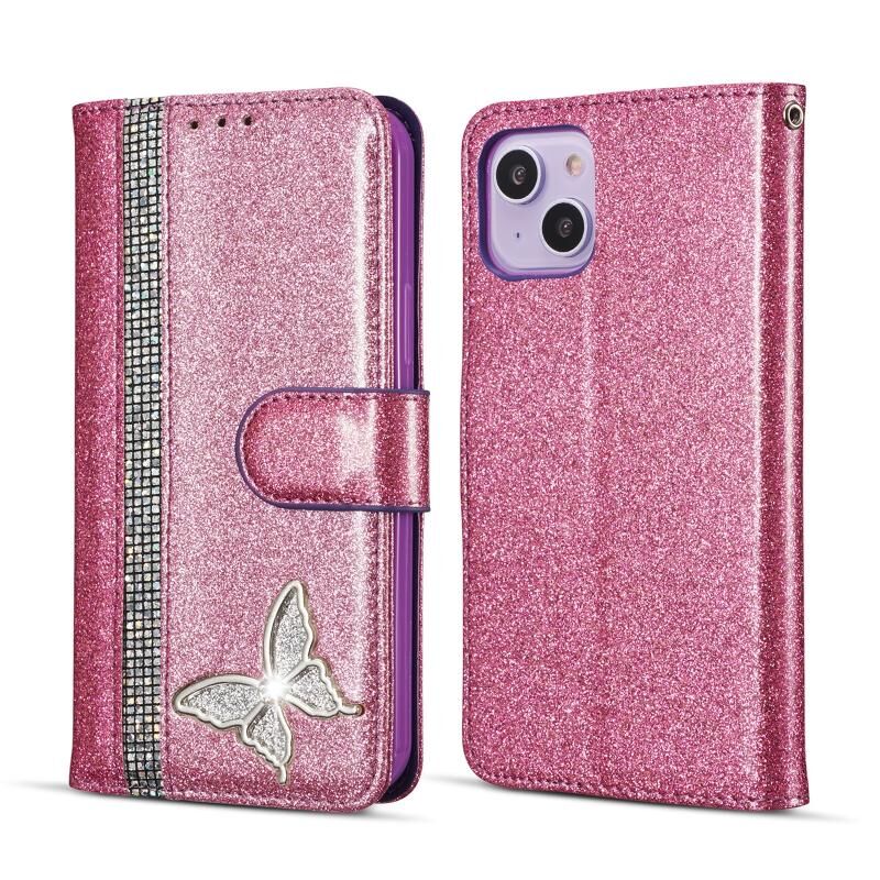 Θήκη τηλεφώνου για iPhone 15 Plus με γκλίτερ, πεταλούδες και δέρμα (Χρυσό ροζ)