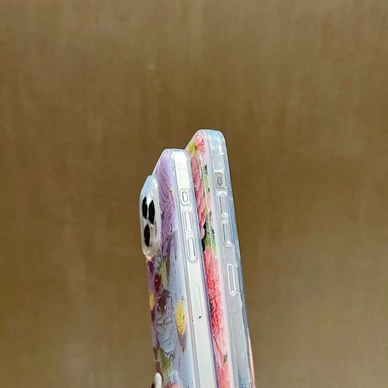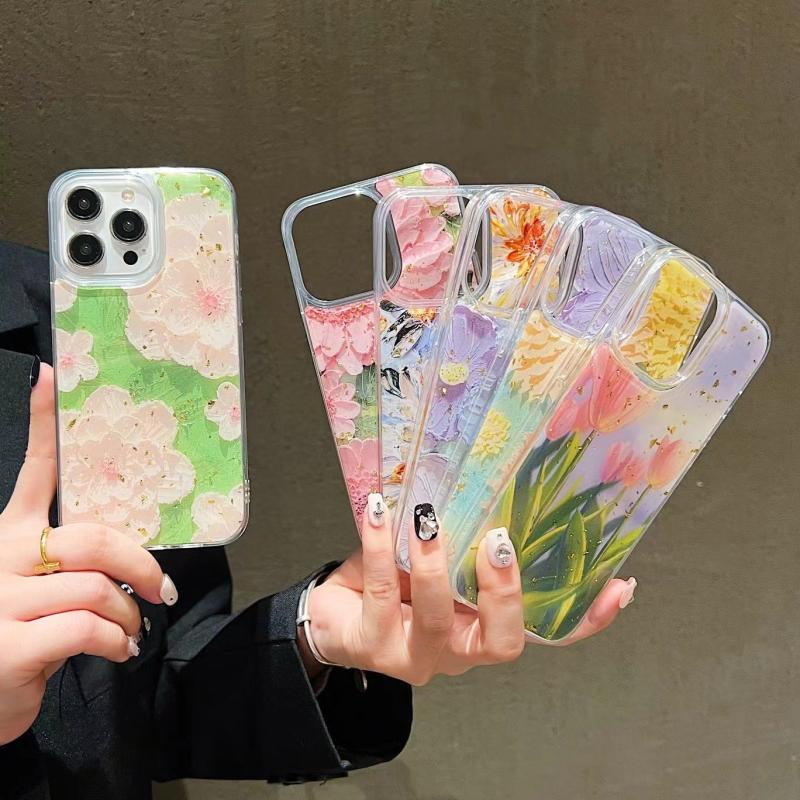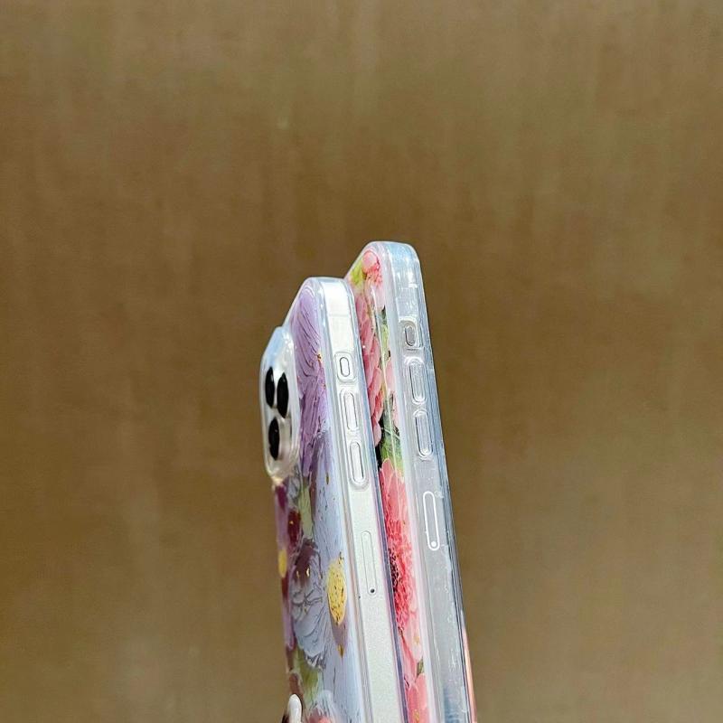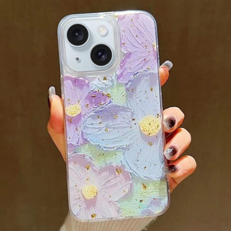 Θήκη τηλεφώνου για iPhone 15 Plus, Χρυσό Φύλλο, Λάδι σε καμβά, Εποξική ρητίνη, TPU (Μπλε και Μωβ Λουλούδια)