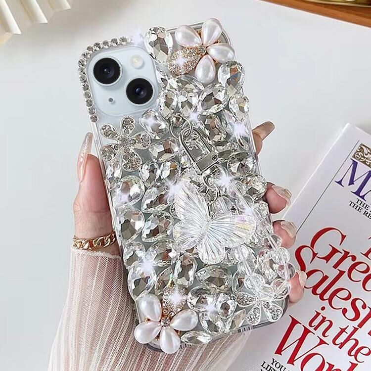 Θήκη τηλεφώνου για iPhone 15 Plus, χειροποίητη, με ενσωματωμένα διαμάντια και σχέδιο πεταλούδας από πολυανθρακικό (λευκό).