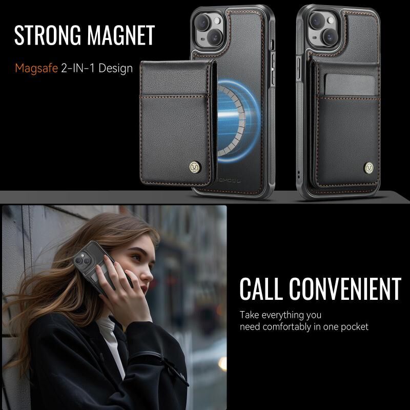 For iPhone 15 Plus JEEHOOD J06 British Style RFID MagSafe Card Bag PU Phone Case(Black) (JEEHOOD)