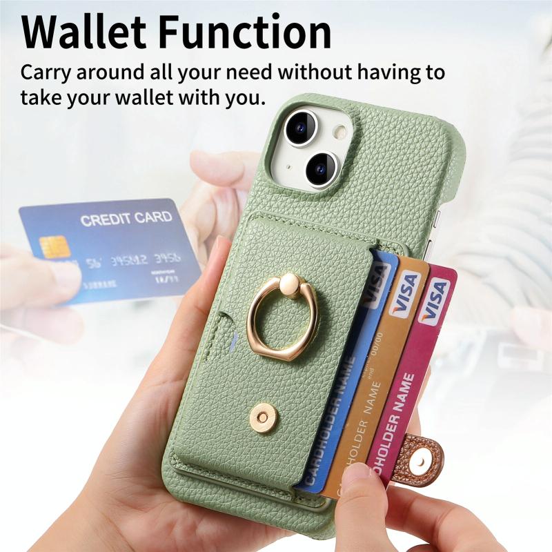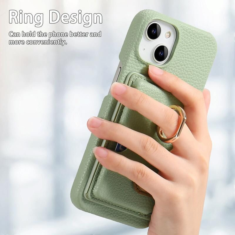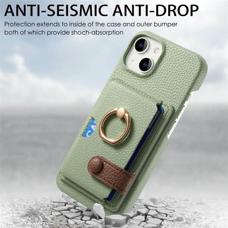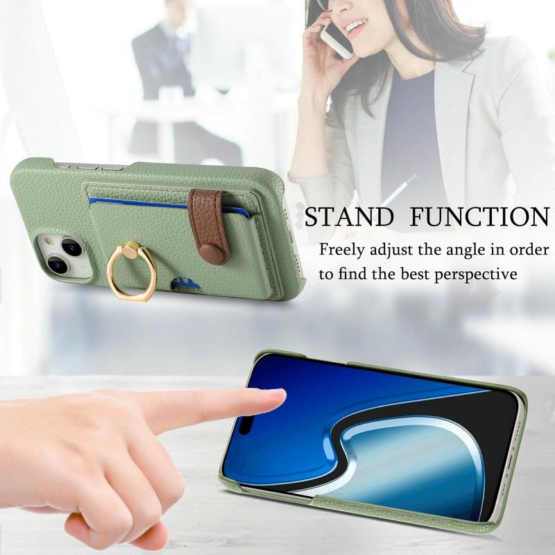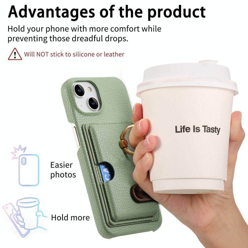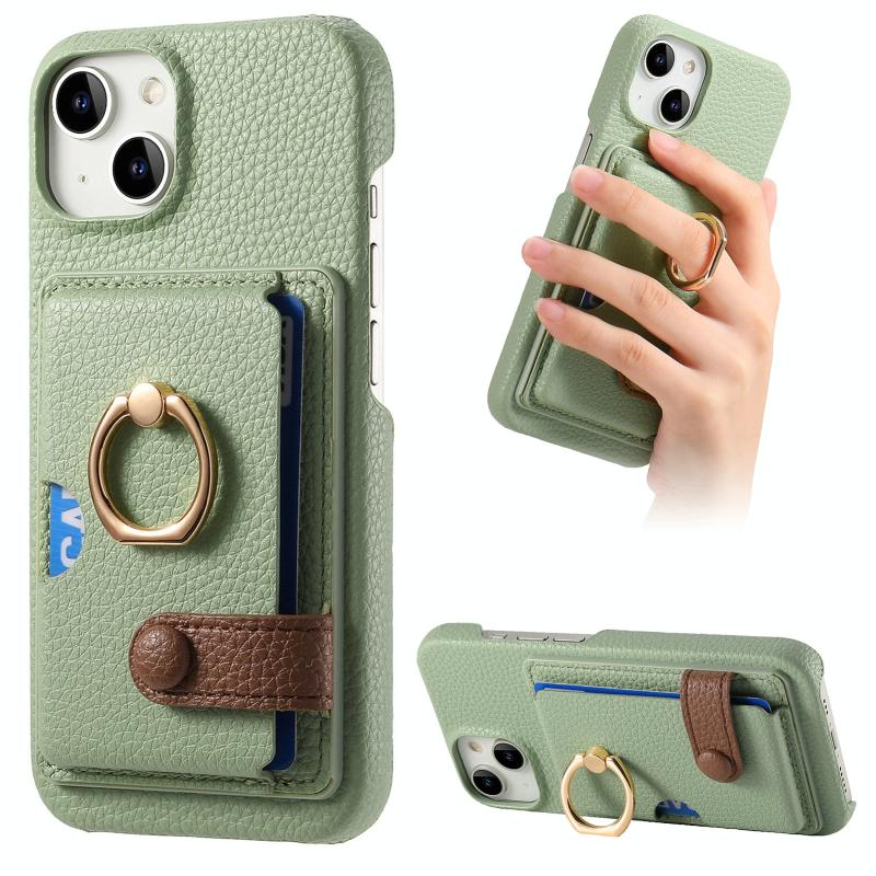 For iPhone 15 Plus Litchi Leather Oil Edge Ring Card Back Phone Case(Tea Green)