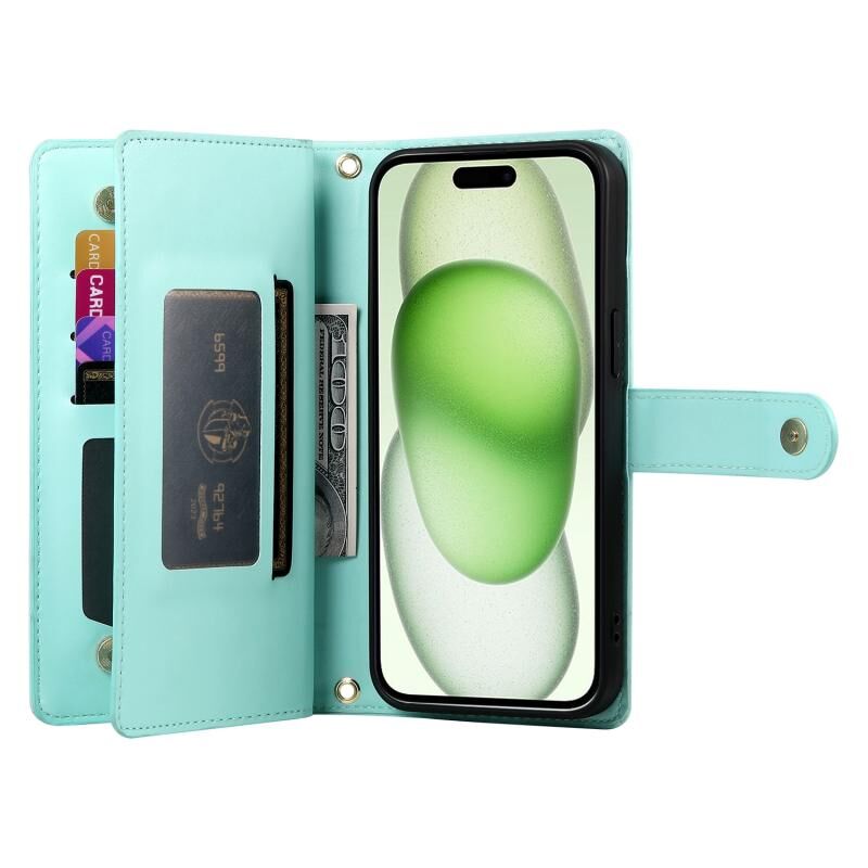 For iPhone 15 Plus Nine Card-slot Zipper Wallet Bag Leather Phone Case(Mint Green)